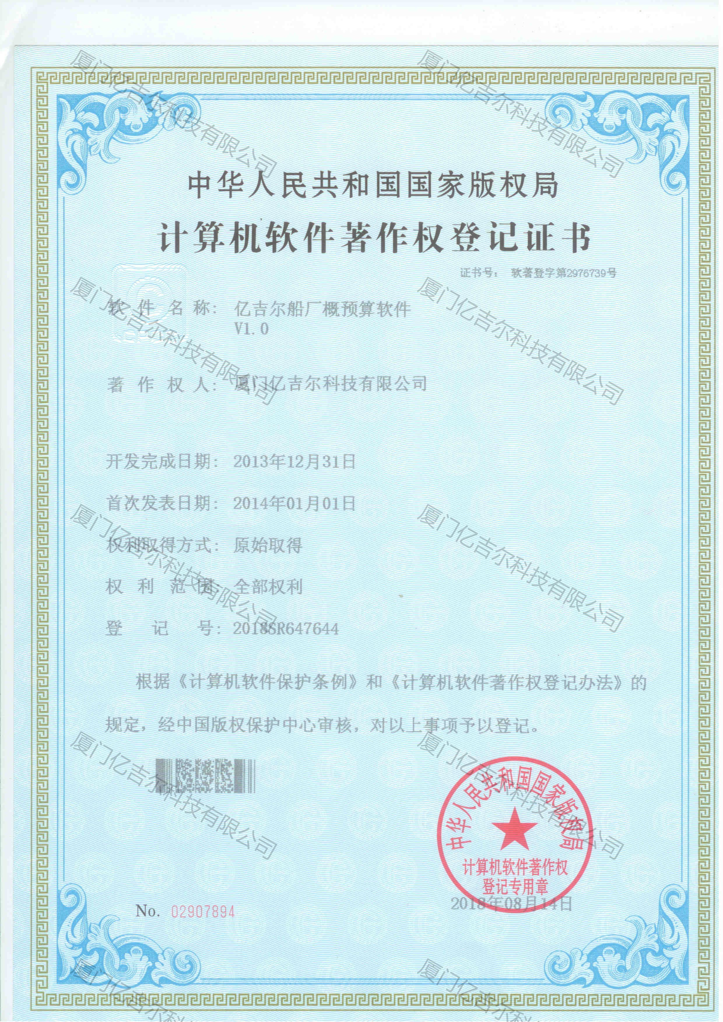 億吉爾船廠概預(yù)算軟件著作權(quán)登記證書 發(fā)布日期:2018年08月14日 瀏覽次數(shù):4345 關(guān)鍵字: 公司 1/1億吉爾船廠概預(yù)算軟件著作權(quán)登記證書