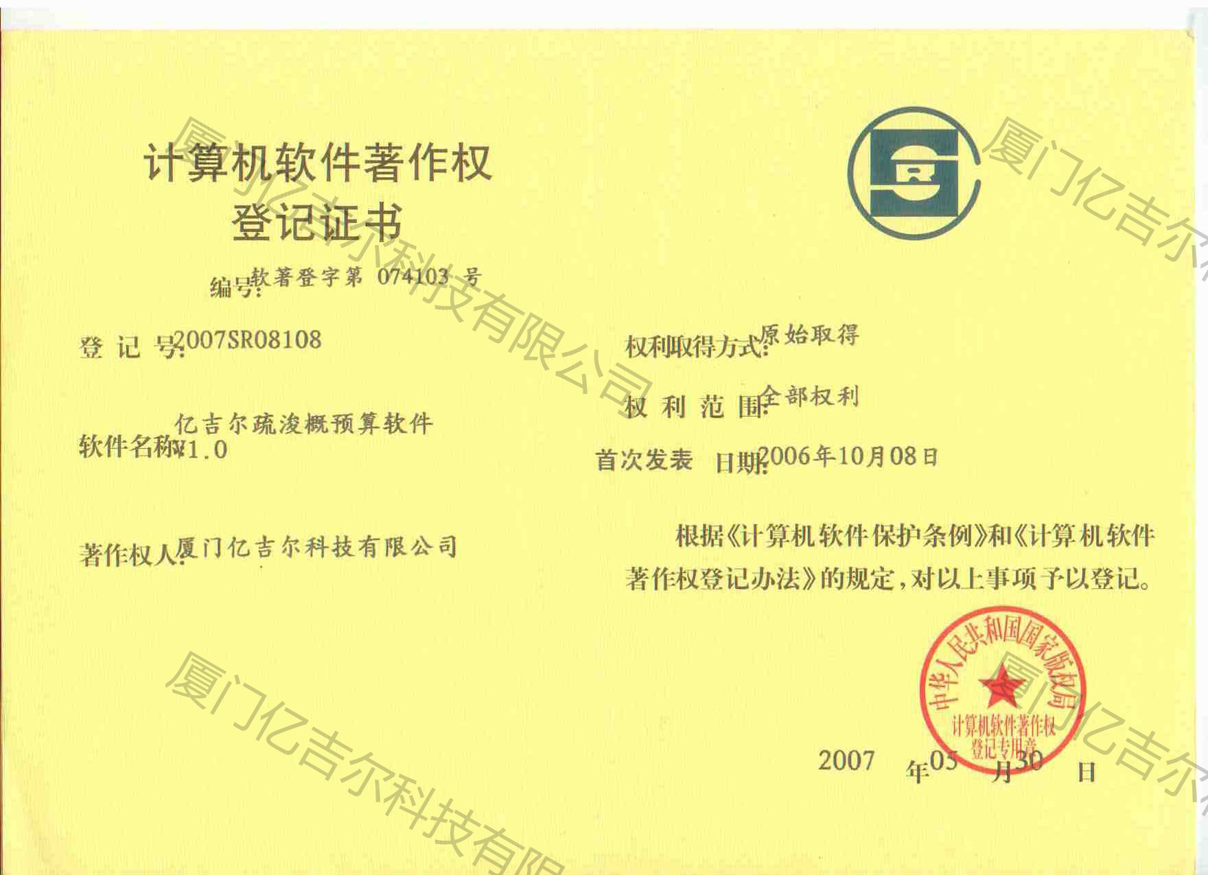 億吉爾疏浚概預(yù)算軟件著作權(quán)登記證書 發(fā)布日期:2007年05月30日 瀏覽次數(shù):4060 關(guān)鍵字: 公司 1/1億吉爾疏浚概預(yù)算軟件著作權(quán)登記證書