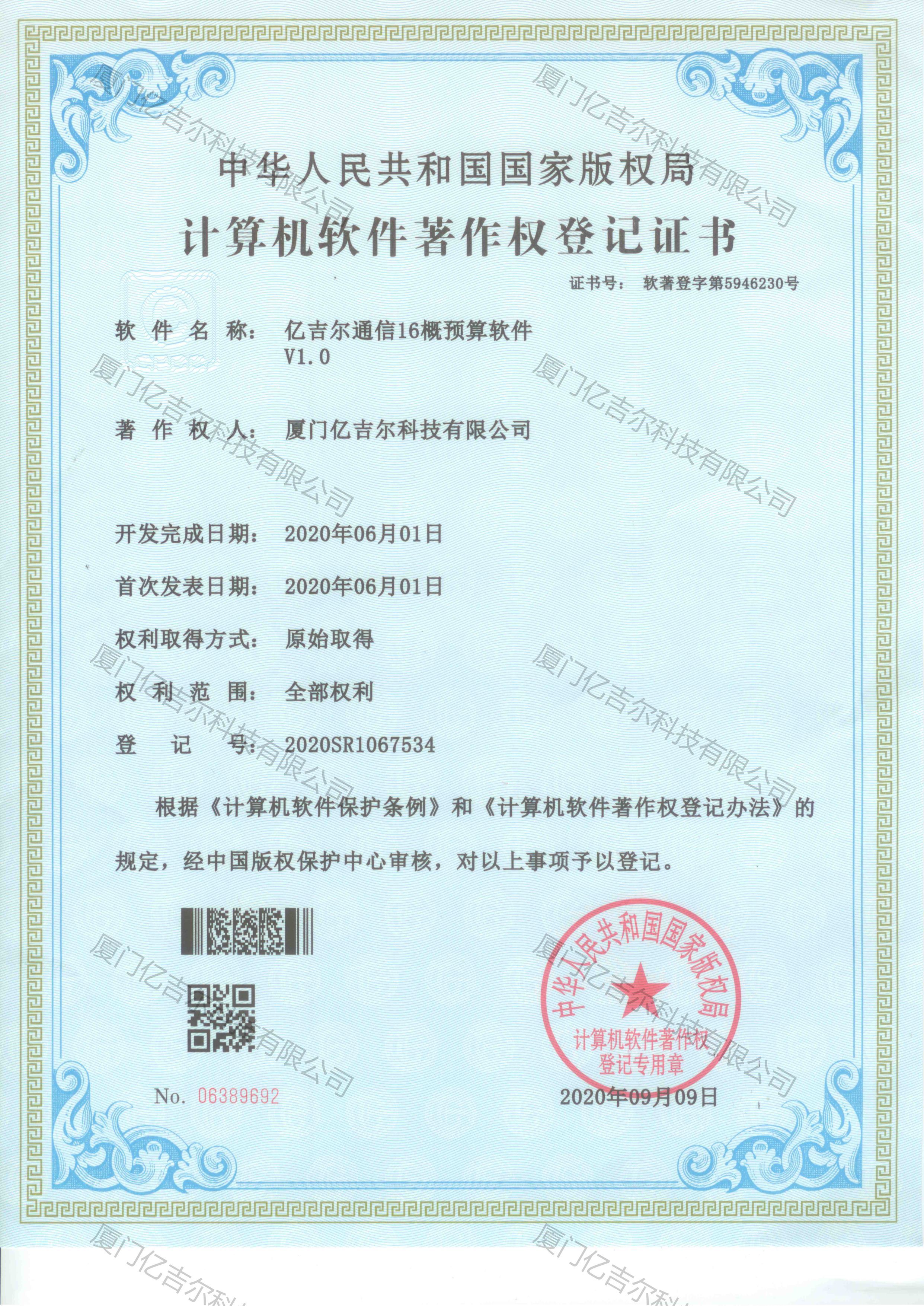億吉爾通信16概預(yù)算軟件著作權(quán)登記證書 發(fā)布日期:2020年09月09日 瀏覽次數(shù):4675 關(guān)鍵字: 公司 1/1億吉爾通信16概預(yù)算軟件著作權(quán)登記證書